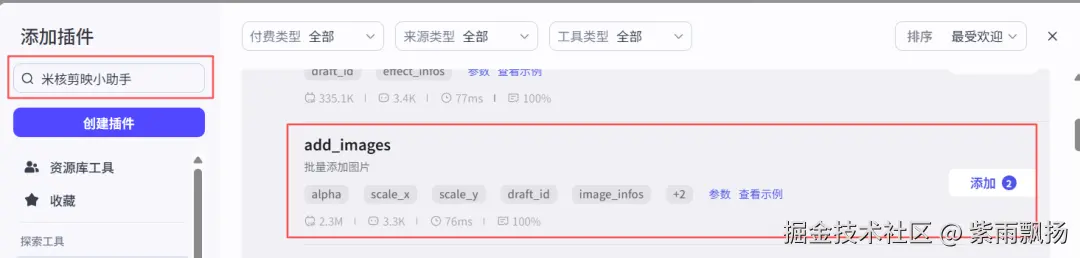(28)添加开场图片该节点的作用是添加开场图片 在添加插件中找到米核剪映小助手->添加一个add_images节点->重命名为添加开场图片->设置参数;