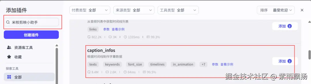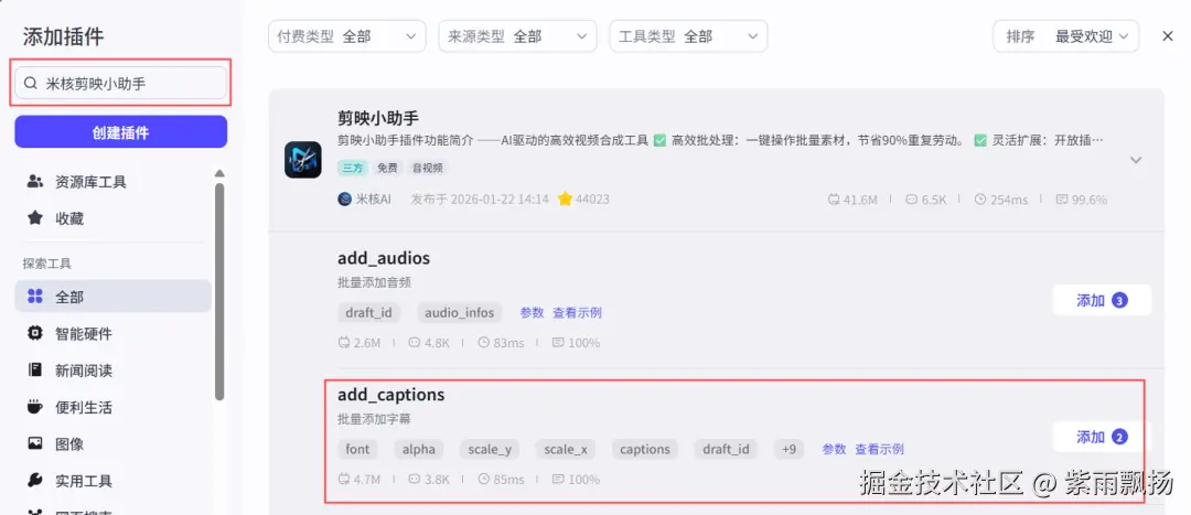 (31)添加正文字幕该节点的作用是添加正文字幕 在添加插件中找到米核剪映小助手->添加一个add_captions节点->重命名为添加正文字幕->设置参数;