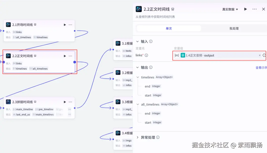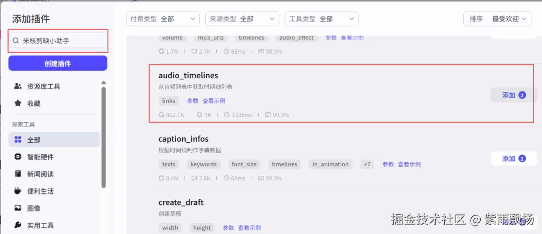 (16)正文时间线该节点的作用是添加正文时间线 在添加插件中找到米核剪映小助手->添加一个audio_timelines节点->重命名为正文时间线->设置参数;插件同15步,参考上面的添加方式