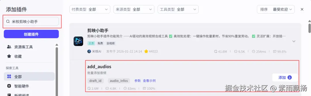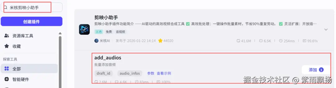 (26)添加开场音频该节点的作用是添加开场音频 在添加插件中找到米核剪映小助手->添加一个add_audios节点->重命名为添加开场音频->设置参数;