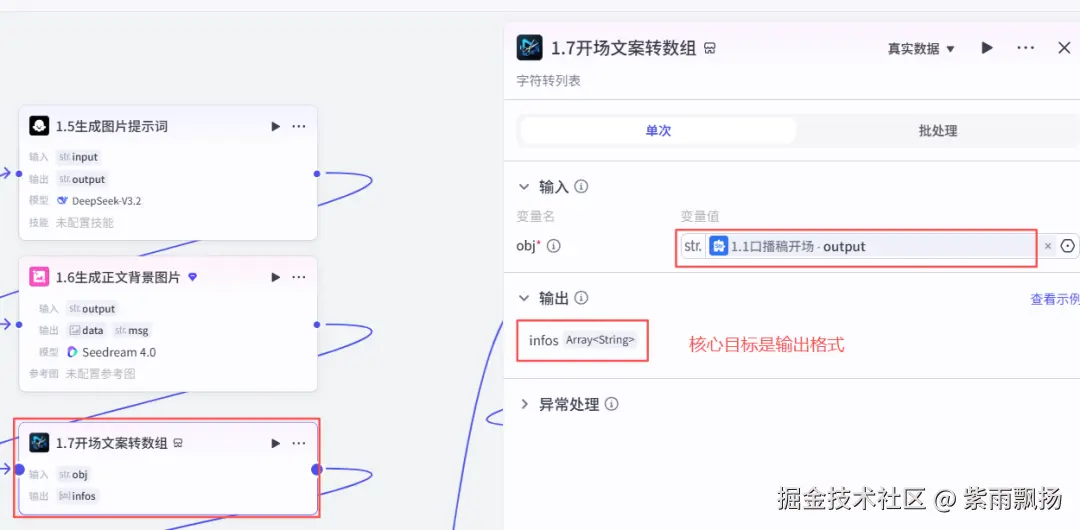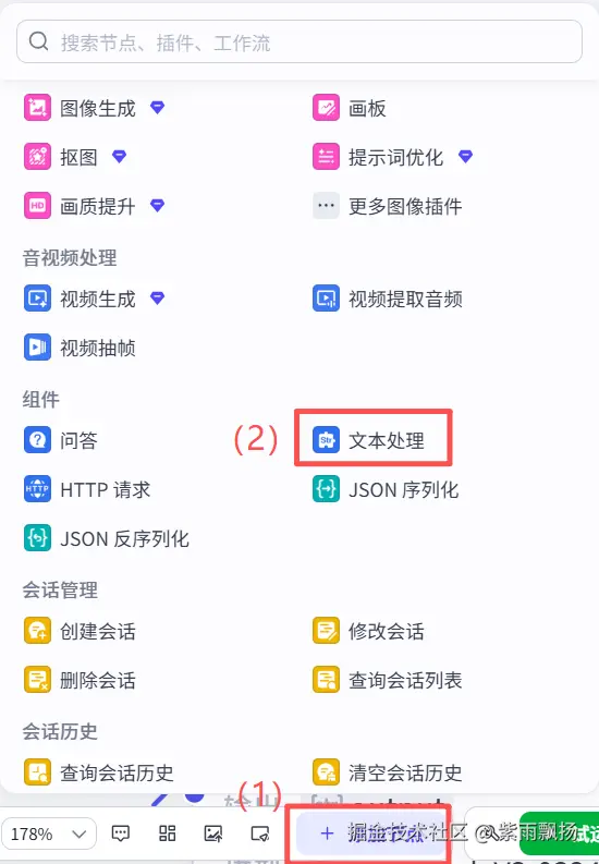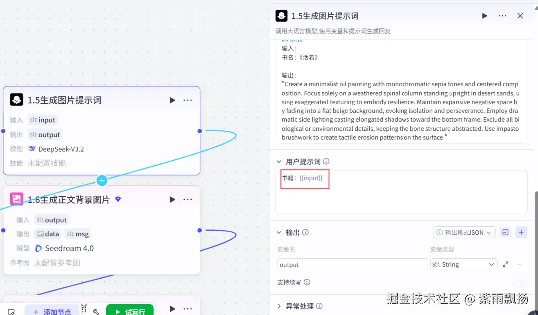 (8)生成正文背景图片该节点的作用是根据生成图文提示词来生成背景图片添加一个图像生成节点->重命名为生成正文背景图片->设置参数和系统提示词;(9)开场文案转数组该节点的作用是对开场文案转换数组格式,方便后面调用 在添加插件中找到米核剪映小助手->添加一个str_to_list节点->重命名为开场文案转数组->设置参数;