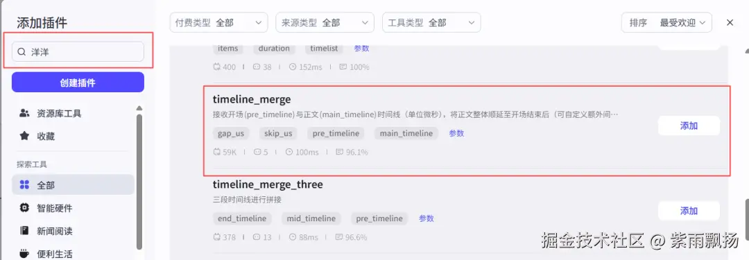 (17)拼接时间线该节点的作用是添加将开始时间线和正文时间线拼接起来 在添加插件中找到剪映小助手辅助工具->添加一个timeline_merge节点->重命名为拼接时间线->设置参数;