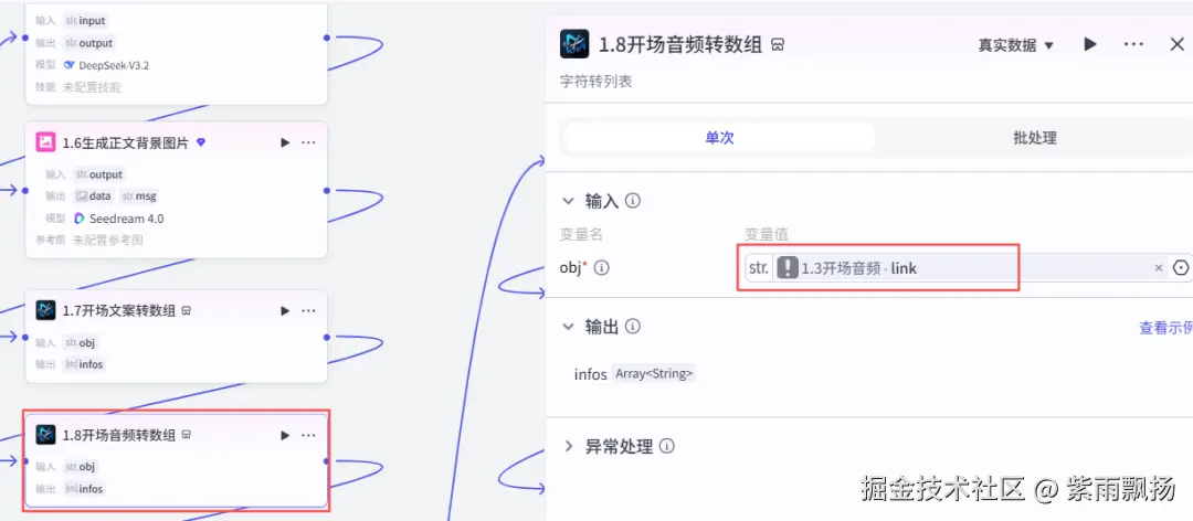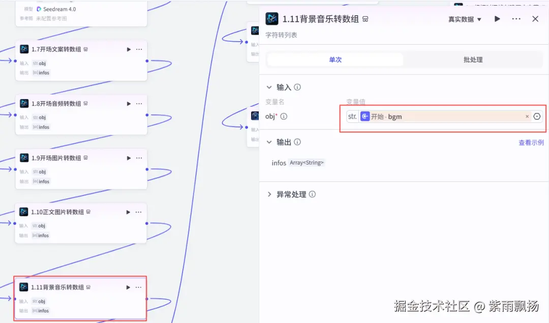 (10)开场音频转数组该节点的作用是对开场音频转换数组格式,方便后面调用 在添加插件中找到米核剪映小助手->添加一个str_to_list节点->重命名为开场音频转数组->设置参数;