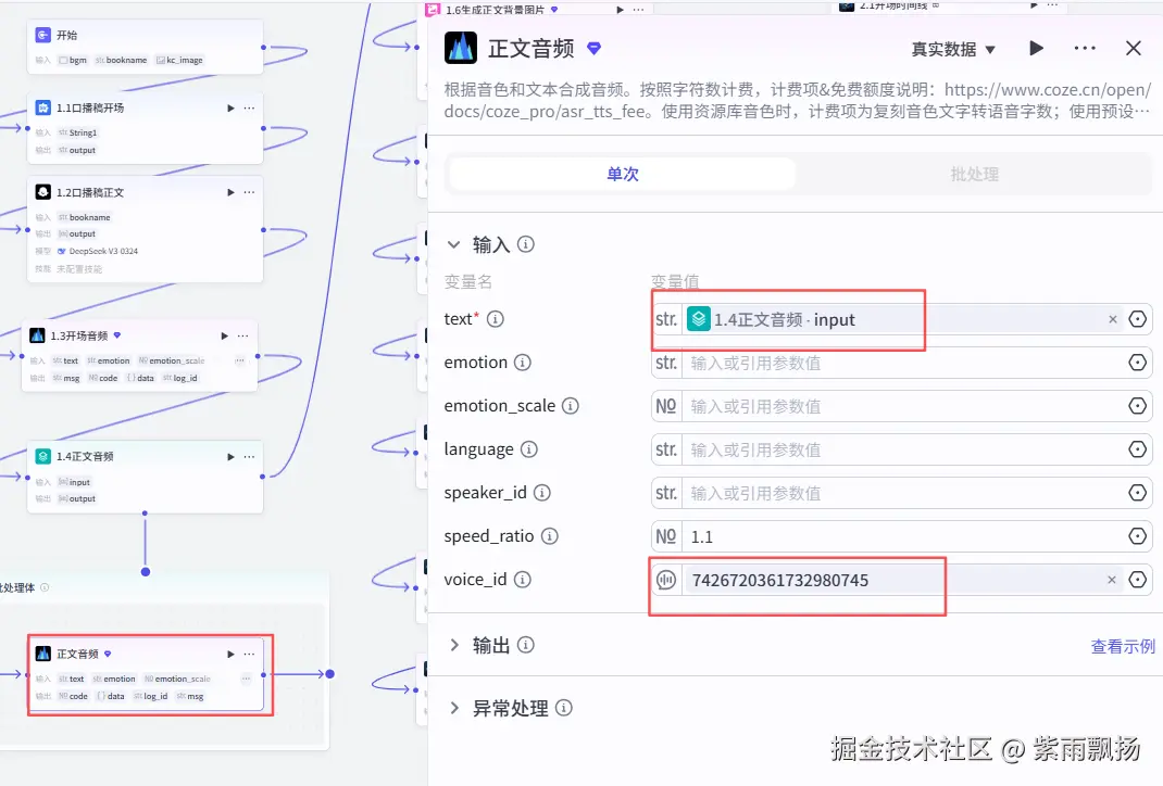(5)开场音频该节点的作用是对口播稿开场进行配音在添加插件中找到语音合成->添加一个speech_synthesis节点->重命名为开场音频->设置参数;(6)正文音频该节点的作用是对口播稿内容进行配音,因为内容是多段的所以需要循环节点来批量处理。添加一个循环节点->重命名为正文音频->设置参数和系统提示词;