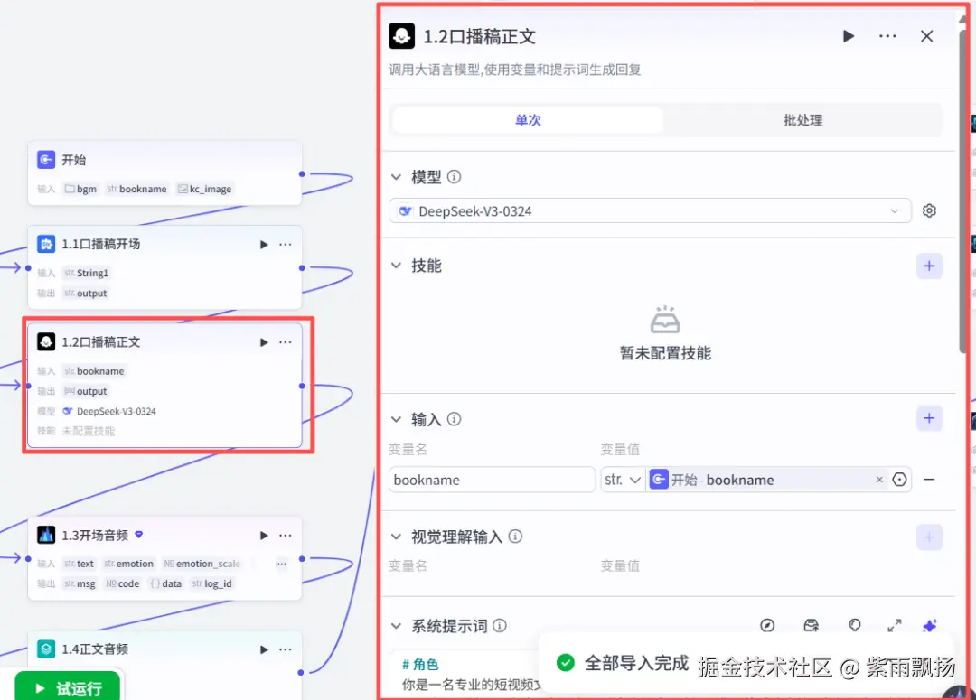 (4)口播稿正文该节点的作用是生成口播稿正文添加一个大模型节点->重命名为口播稿正文->设置参数和系统提示词;