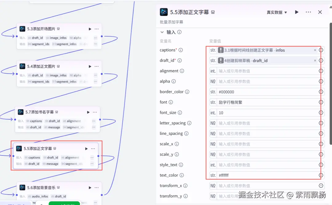 (30)添加书名字幕该节点的作用是添加书名字幕 在添加插件中找到米核剪映小助手->添加一个add_captions节点->重命名为添加书名字幕->设置参数;