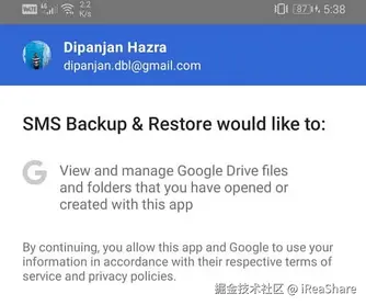 - 点击 “立即备份”,等待所有短信完成备份。(授权提示:短信备份与恢复工具请求获取以下权限 —— 查看并管理你通过该应用打开或创建的谷歌云端硬盘文件和文件夹。继续操作即表示你允许该应用与谷歌按照其各自的服务条款和隐私政策使用你的相关信息。)