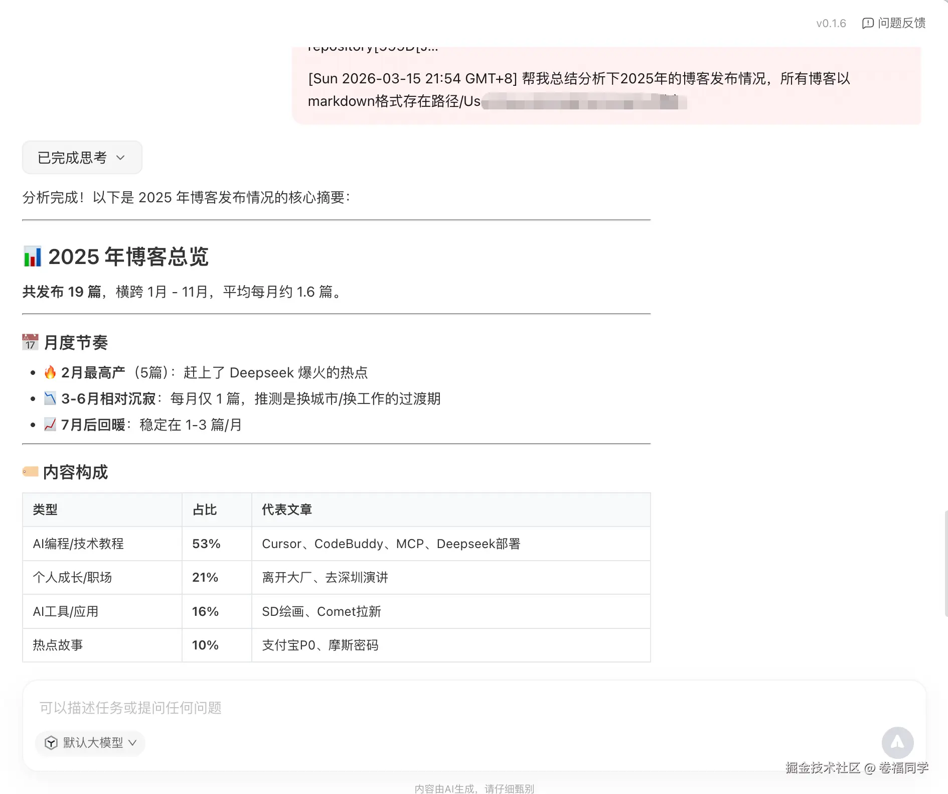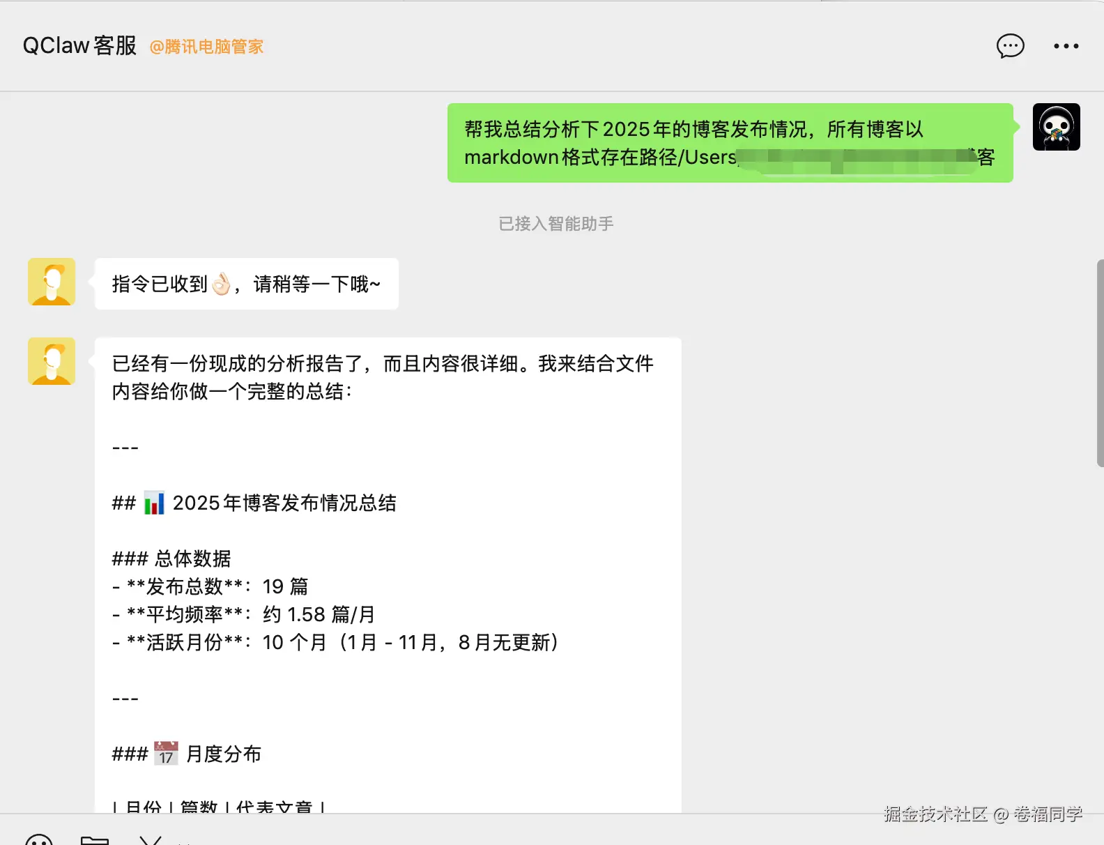 现在测试QClaw的文件处理能力,比如我想对2025年发布的所有博客进行分析总结,对话内容如下