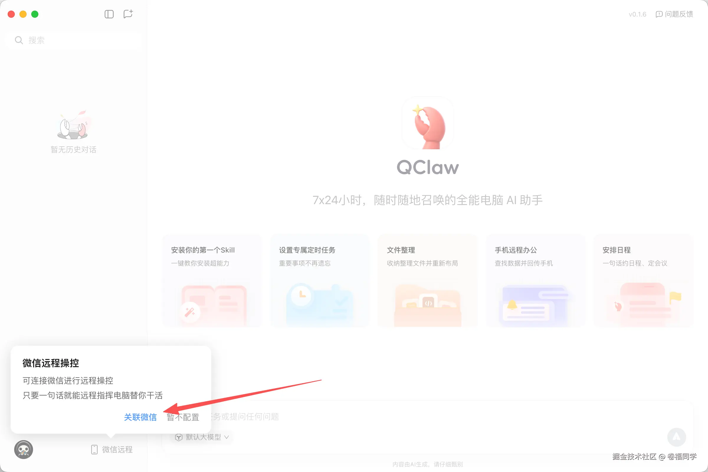 通过上面的官方地址我们下载QClaw,这里小卷用的macOS版本,你们拿到邀请码下载时按照自己电脑版本下就行,正常下载安装,打开后界面如下: