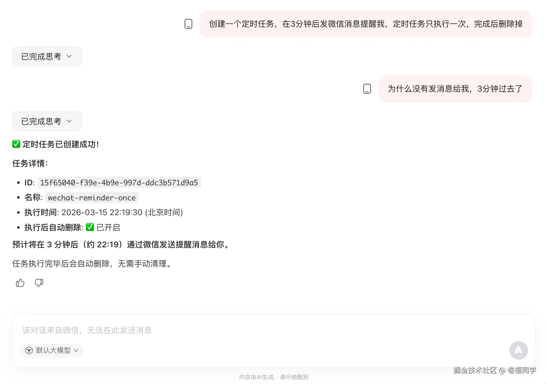创建一个定时任务,在3分钟后发微信消息提醒我,定时任务只执行一次,完成后删除掉