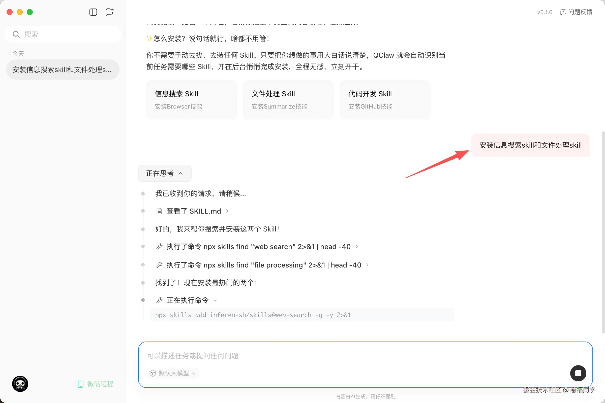咱就不对基础功能进行测试了,我们就看看它是不是真的能干活啊,首先安装一些常用的skill(网络搜索、文件处理等等),直接和QClaw对话就可以安装了