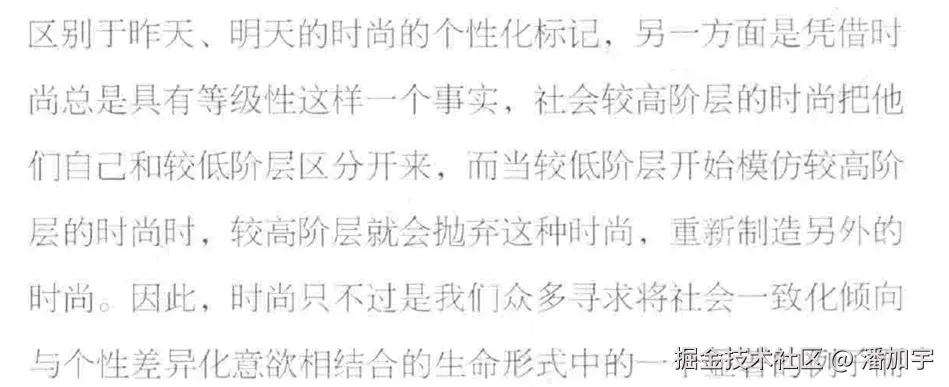 另一个容易出现的误解,以为德国社会学家Georg Simmel(格奥尔格·齐美尔)在19世纪末和20世纪初发表的关于时尚的说法是起源,但齐美尔的说法是这样的: