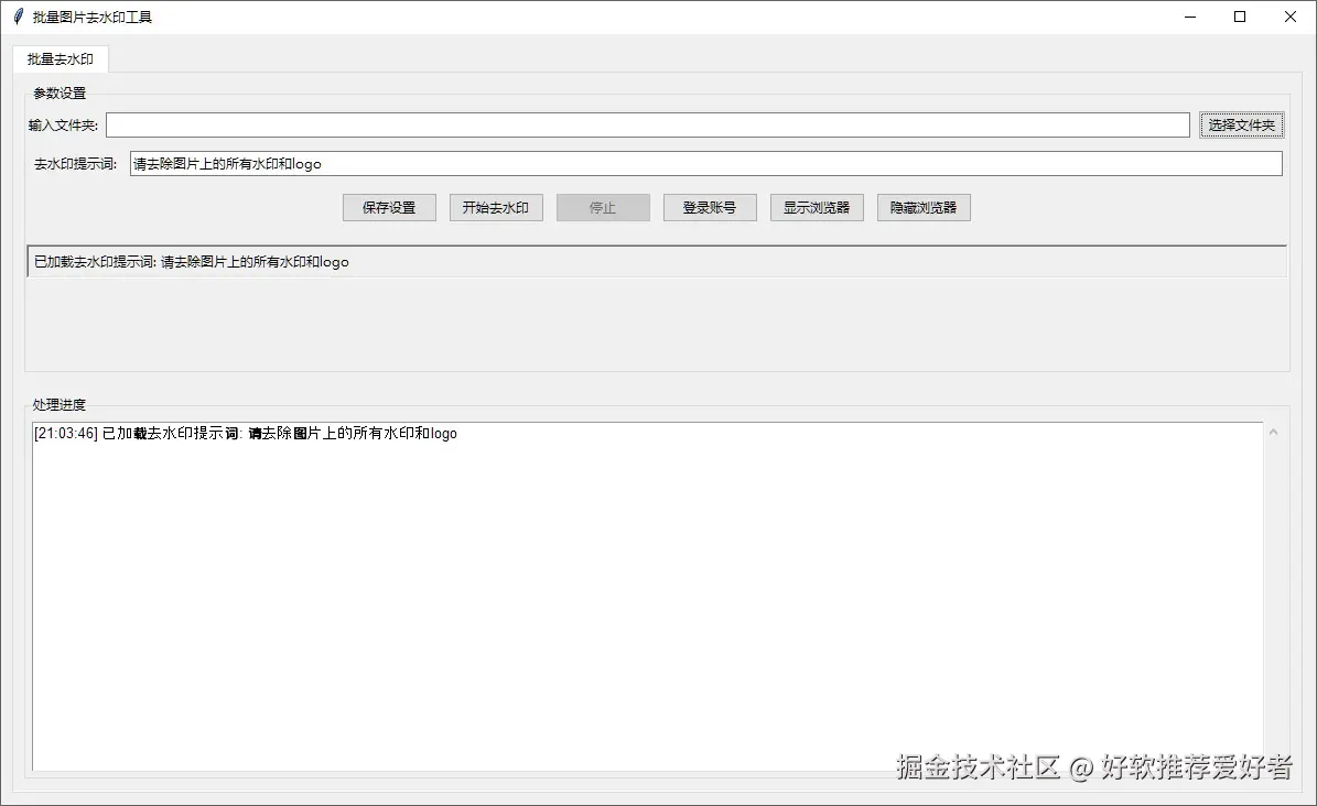 - 功能按钮:配备保存设置、开始去水印、停止、登录账号、显示 / 隐藏浏览器等实用按钮,操作简单便捷。