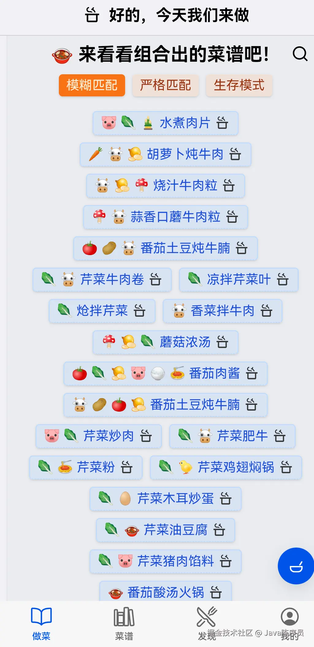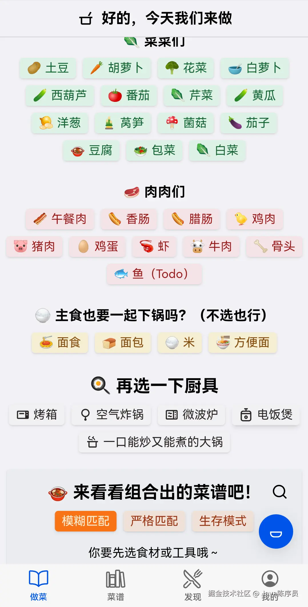 - 按食材找菜:可根据现有材料选择蔬菜 + 肉 + 主食 + 厨具生成菜谱,再根据模糊匹配、严格匹配、生错模式三种机制进行筛选