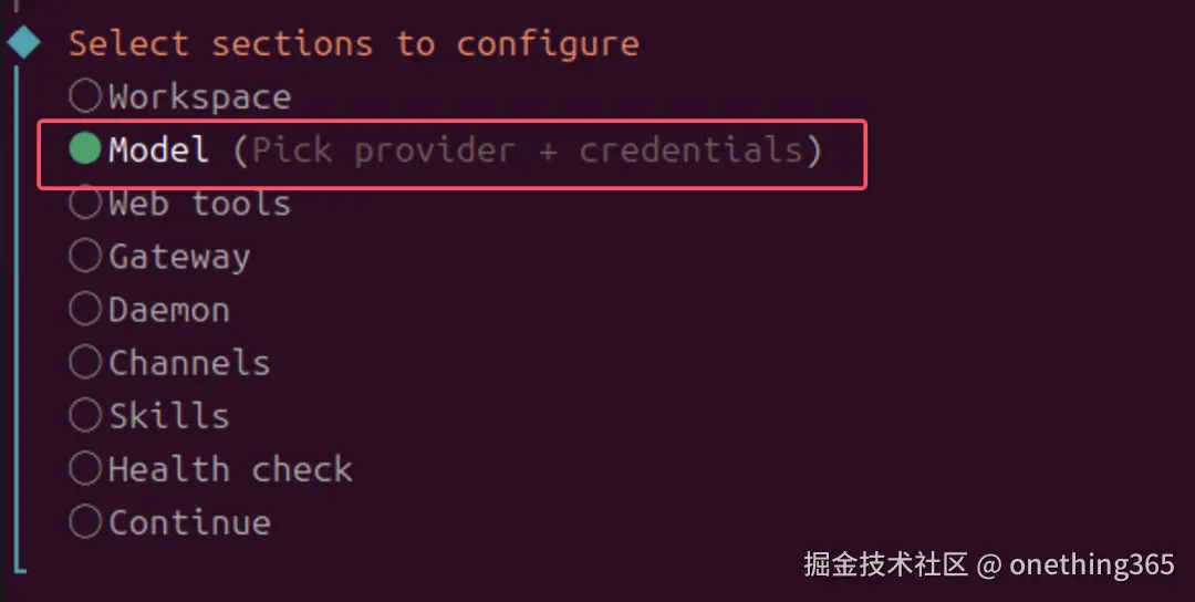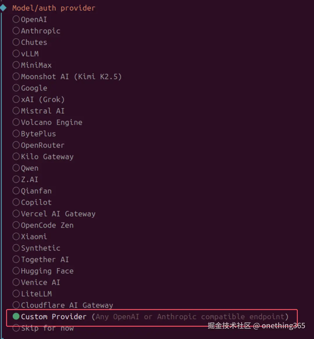 在配置选项中,选择“自定义模型”。这意味着我们将手动指定要连接的模型服务,而不是使用OpenClaw预设好的那些。