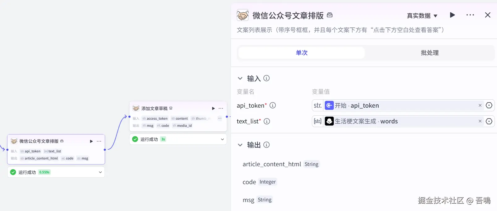 这个节点的作用是对生成好的文案进行排版,使用到了扣子的三方插件【公众号文章模板】的【text_list_qa】工具。