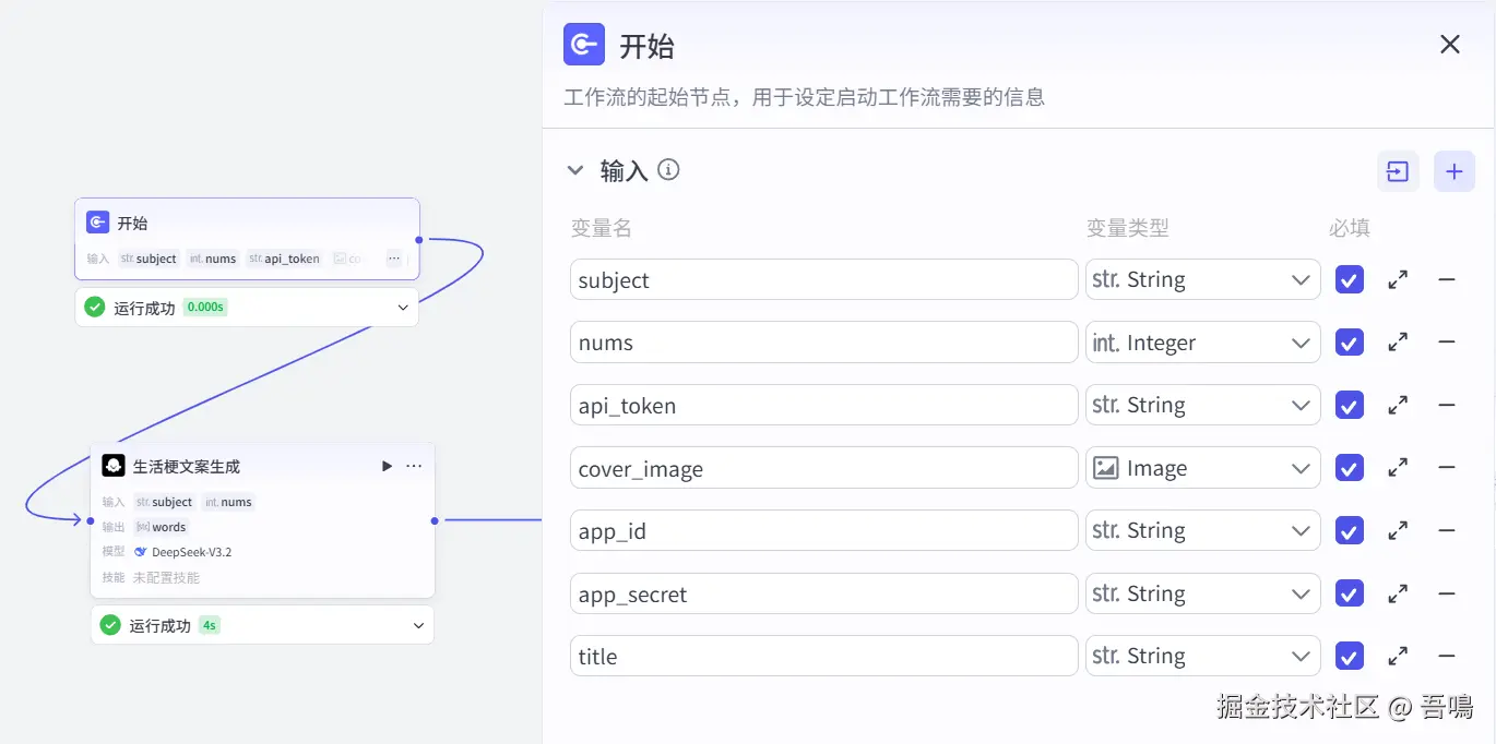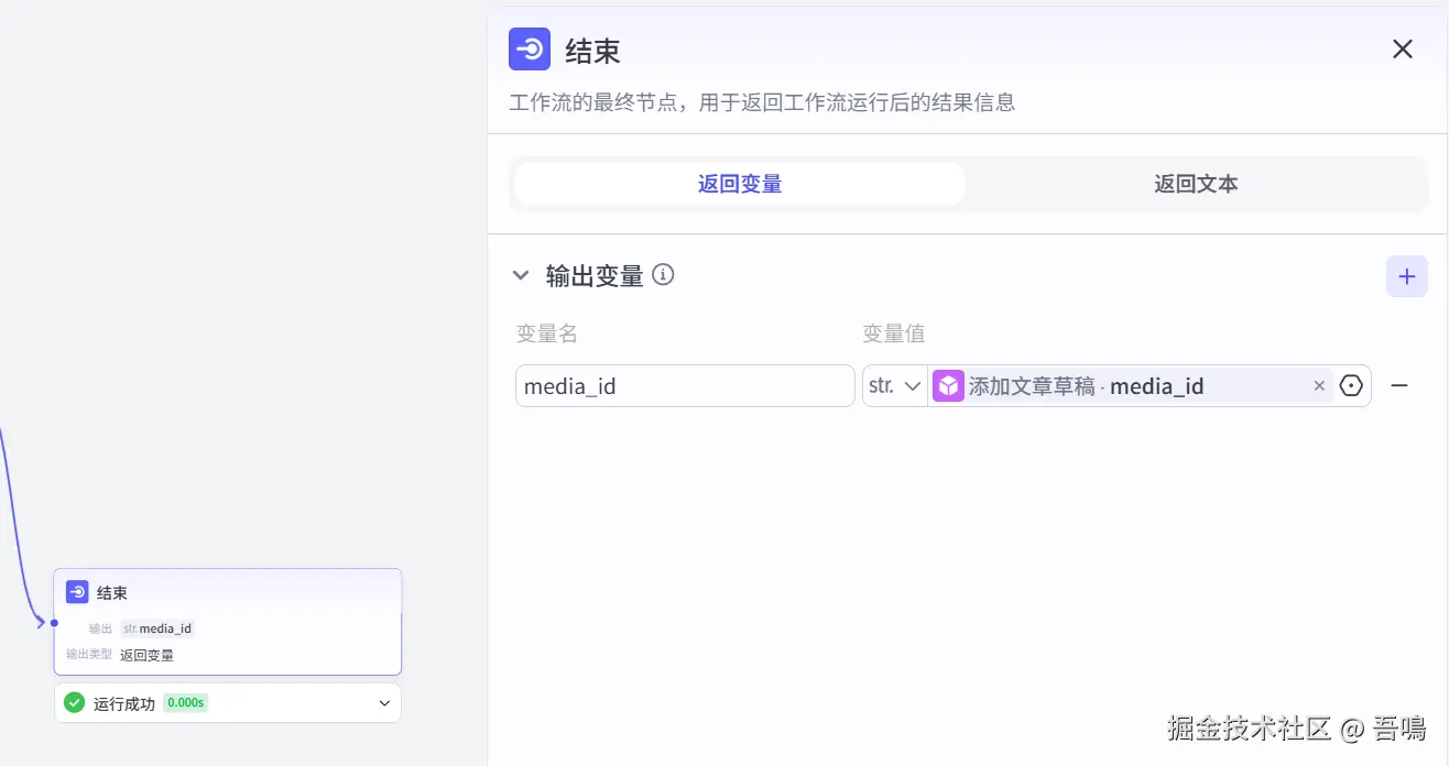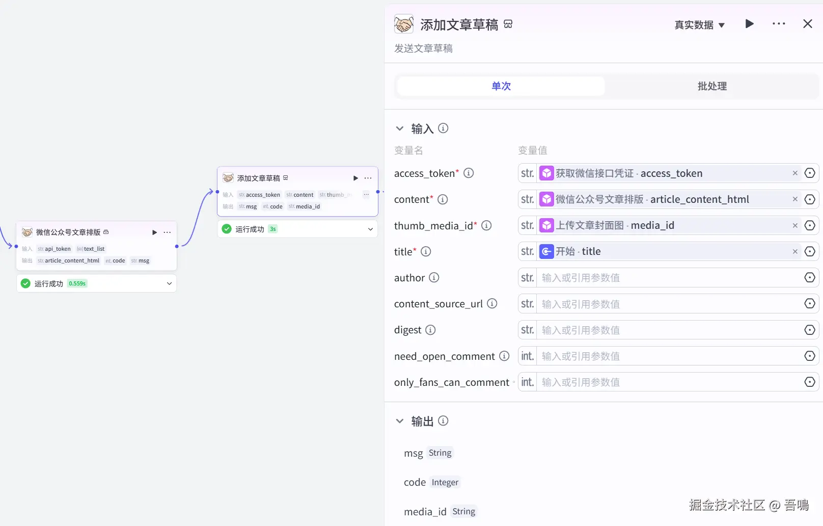 这个节点的作用是用于生成文章的草稿,使用到了扣子的三方插件【微信公众号接口】的【add_draft】工具。