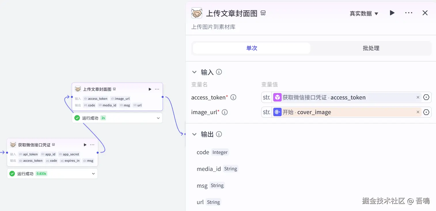 这个节点的作用是把文章的封面图上传到公众号的素材库中,使用到了扣子的三方插件【微信公众号接口】的【wx_upload_image】工具。