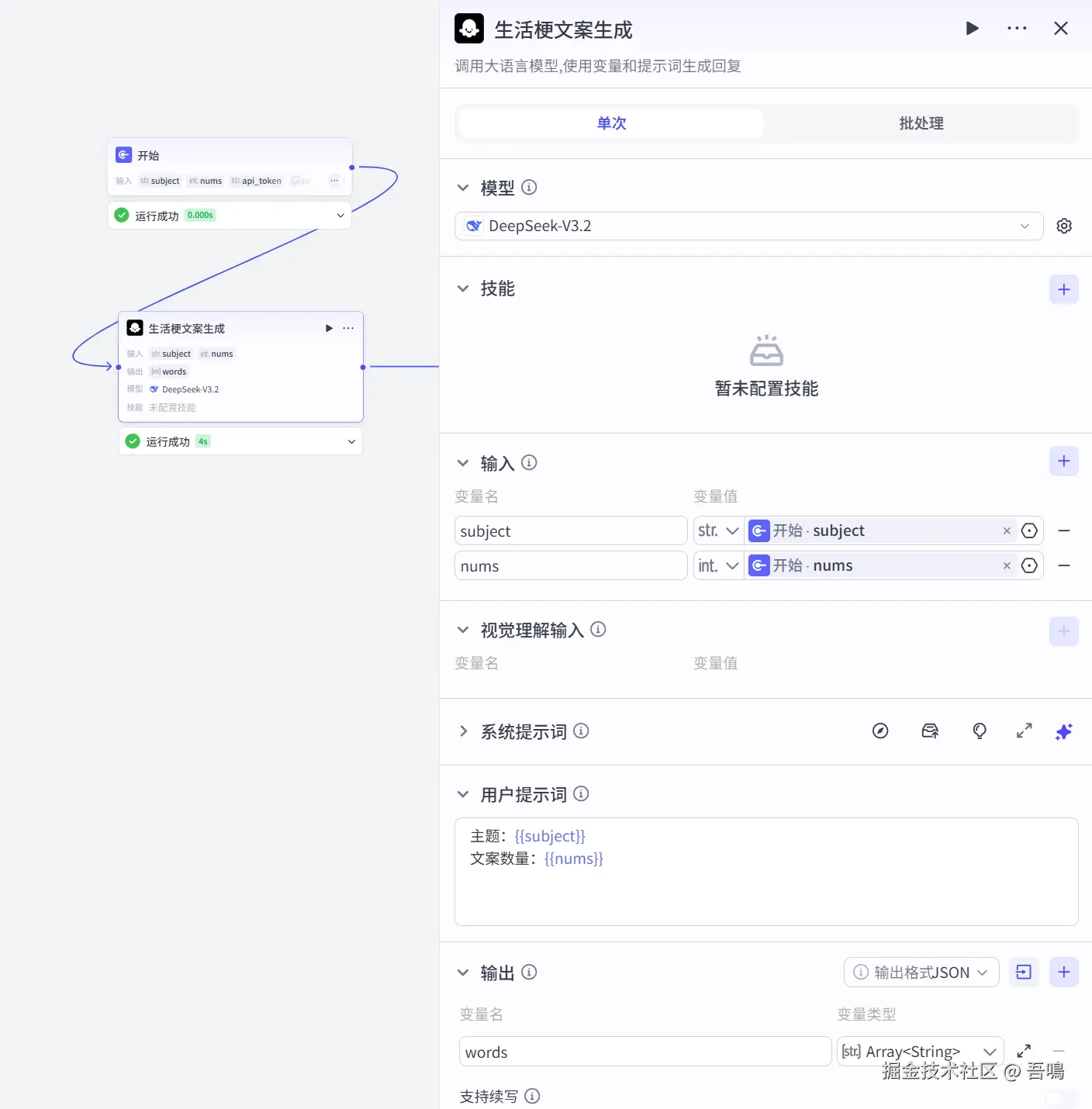 这个节点使用到了扣子官方的大模型节点,用来生成文案,由于文章篇幅原因,系统提示词我打包放到了文末,感兴趣的朋友可以按照文末的方式领取。