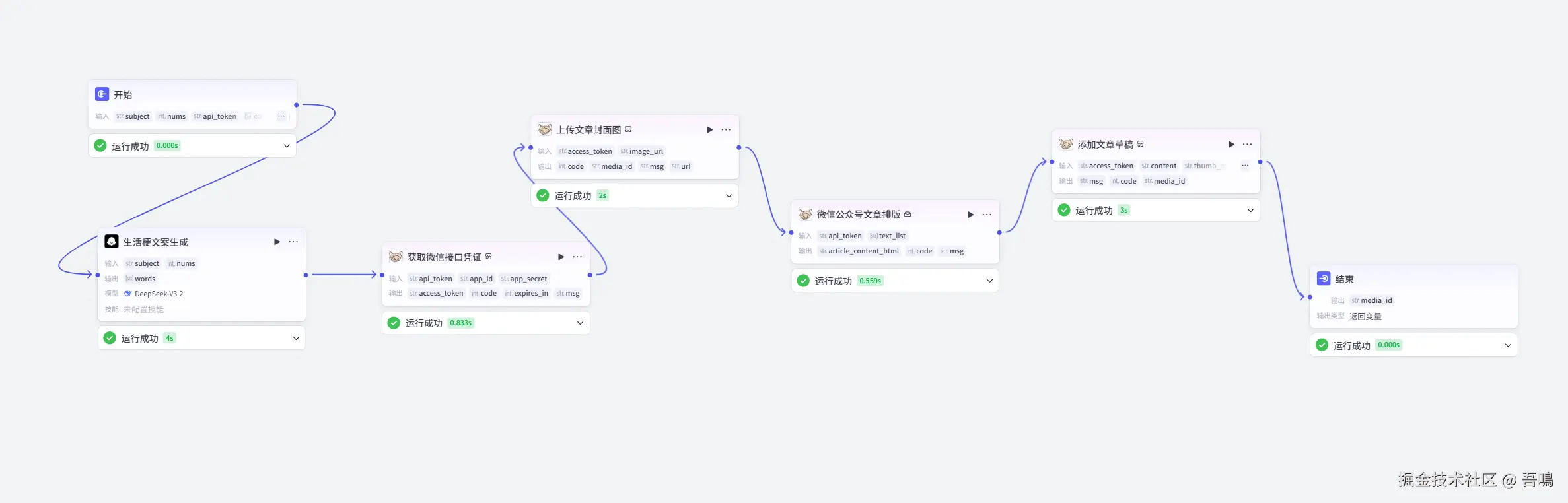 在开始工作流的讲解之前,先来看看效果,比如我输入了“以前是什么,现在是什么”这么个主题,设计好文章的标题和封面图,一分钟左右,一篇公众号文章就生成了。