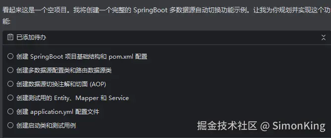 通过待办事项,我们可以看到智能体很贴心的帮我们分了包,使用了AOP技术,还编写了测试用例。已经非常出乎我的意料了,我们看看几步能成功!