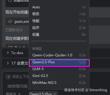由于Qoder赠送的Credit所剩无几,我们使用消耗比较少的Qwen3.2-Plus模型来完成。