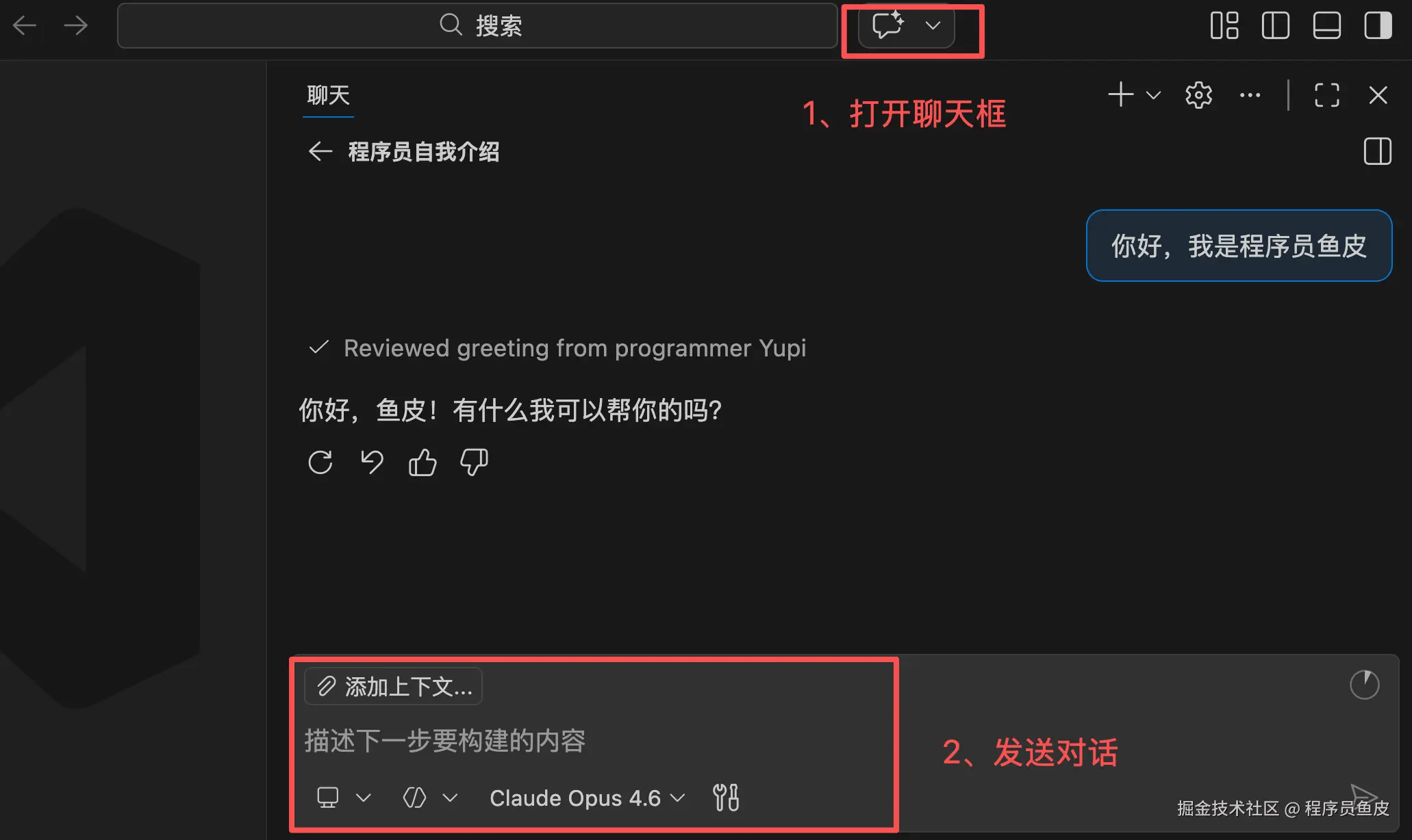 点击 VSCode 上方的「聊天按钮」,打开 Chat 对话面板,你就可以和 AI 愉快地聊天了。让它分析需求、写代码、改 Bug,啥都行。