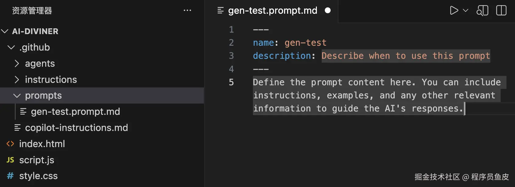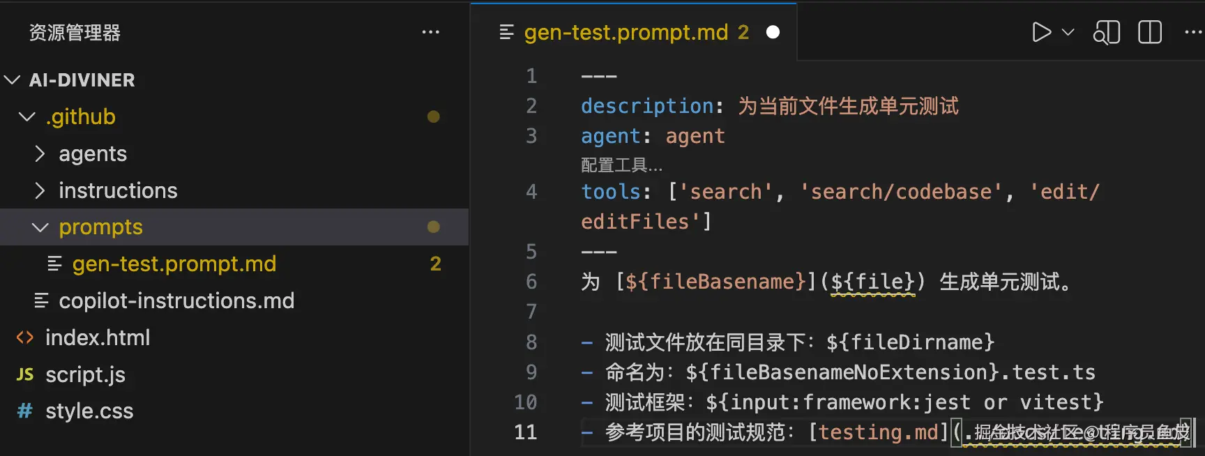 你也可以直接在 .github/prompts/ 目录下创建 .prompt.md 文件。举个例子,创建一个 /gen-test 命令来自动生成单元测试: