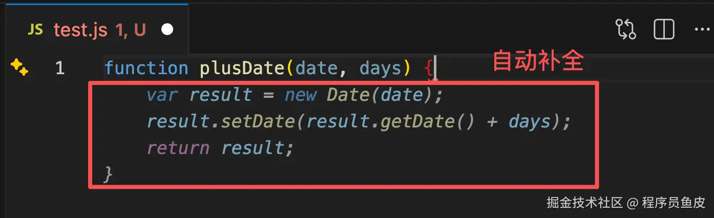 写代码的时候,Copilot 会自动给你浅色的补全建议,按一下 Tab 就能接受。比如你写了一个计算日期的函数名 plusDate,它能直接帮你把整个函数体补全出来。