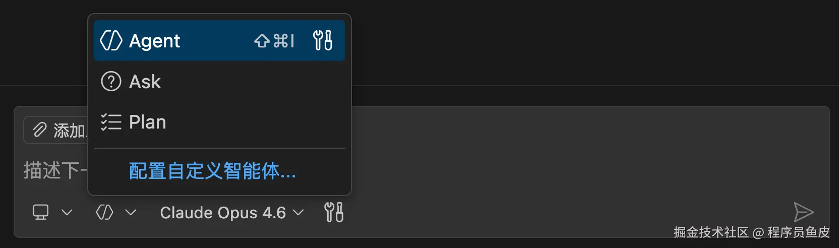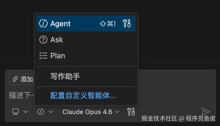 对话框区域有一个 智能体选择器,可以在 3 种内置模式之间切换: