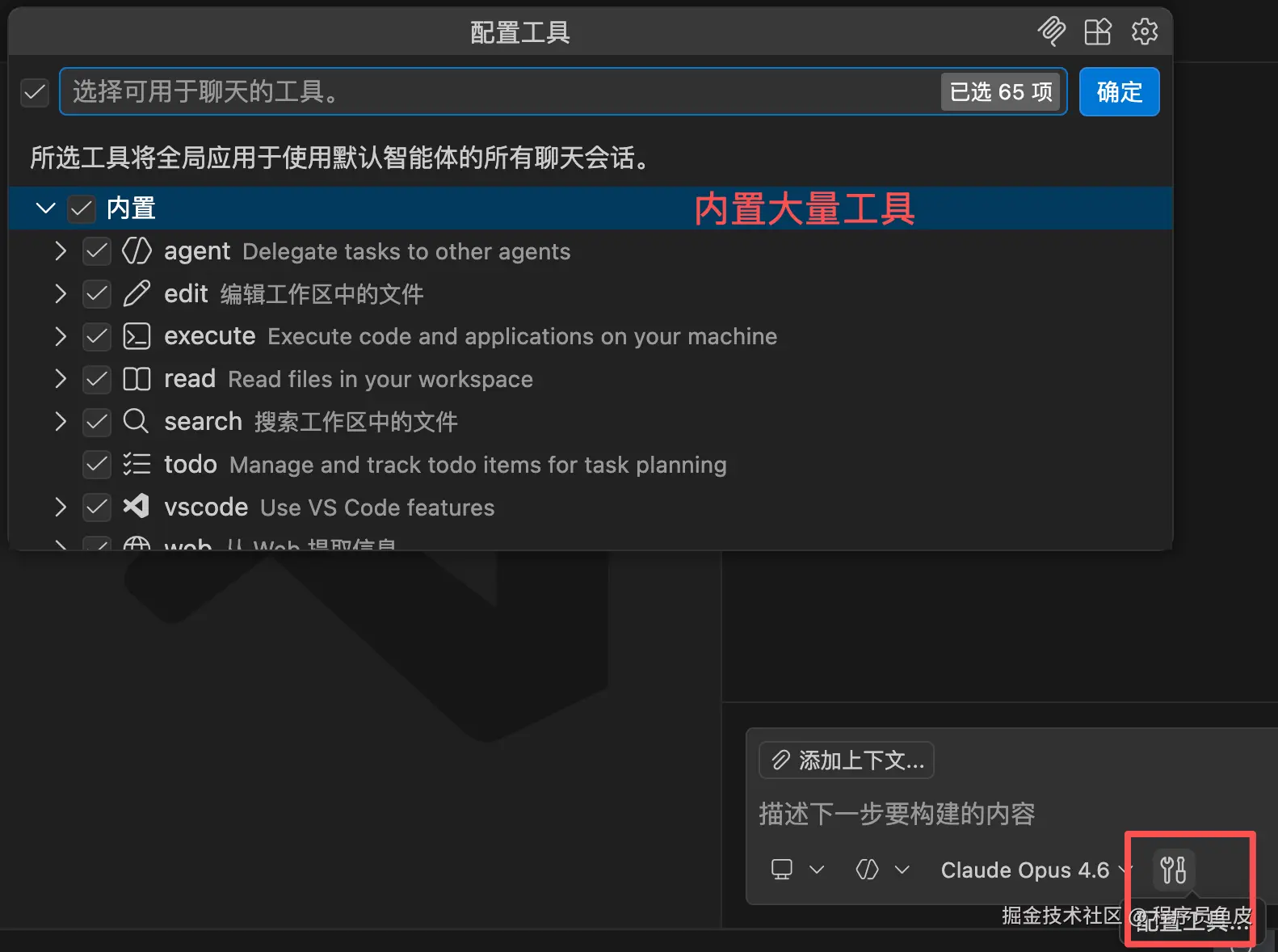 所有工具都可以通过 Chat 对话区域的「配置工具」按钮进行可视化管理,很方便: