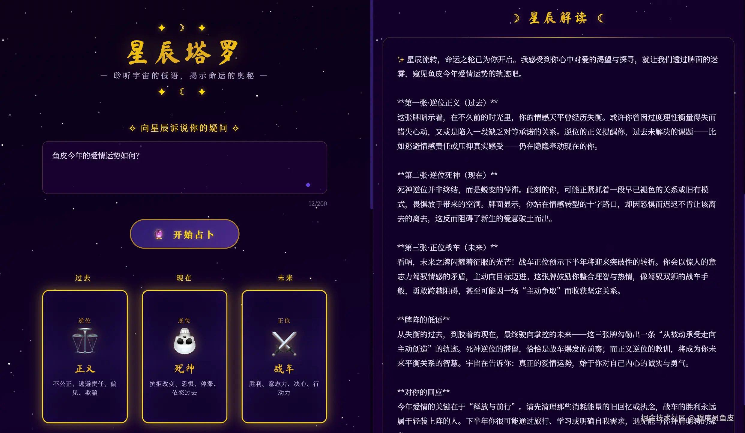 三张塔罗牌依次翻开,下方出现 AI 生成的占卜解读。深紫色的星空背景,搭配金色边框,再加上流畅的翻牌动画,效果还真挺唬人的。