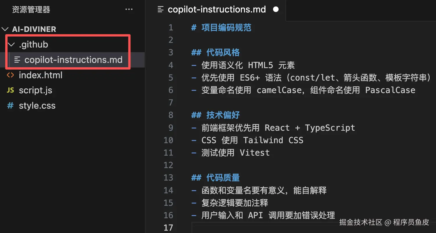 或者手动在项目根目录下新建 .github/copilot-instructions.md 文件,填入内容即可,比如: