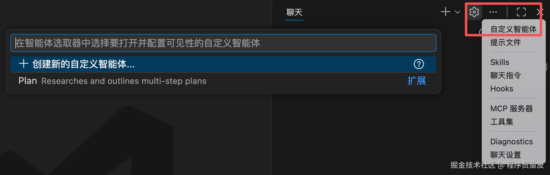 一种是在对话区域的设置中打开「自定义智能体」,选择创建位置(当前项目或用户目录),VSCode 会自动创建对应的文件: