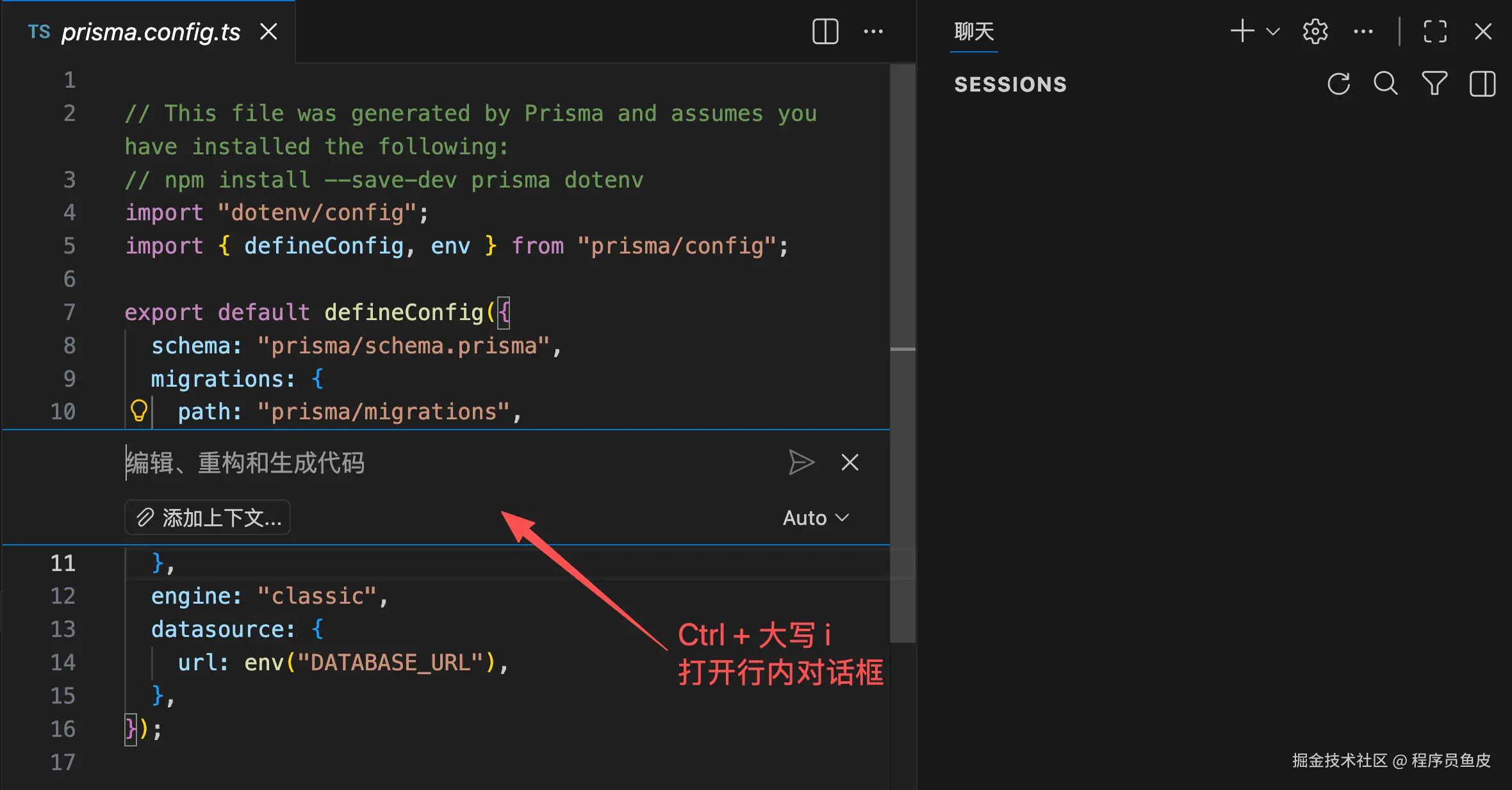1)按 Ctrl+I(Mac 是 Cmd+I)打开行内对话,直接在代码中跟 AI 交互: