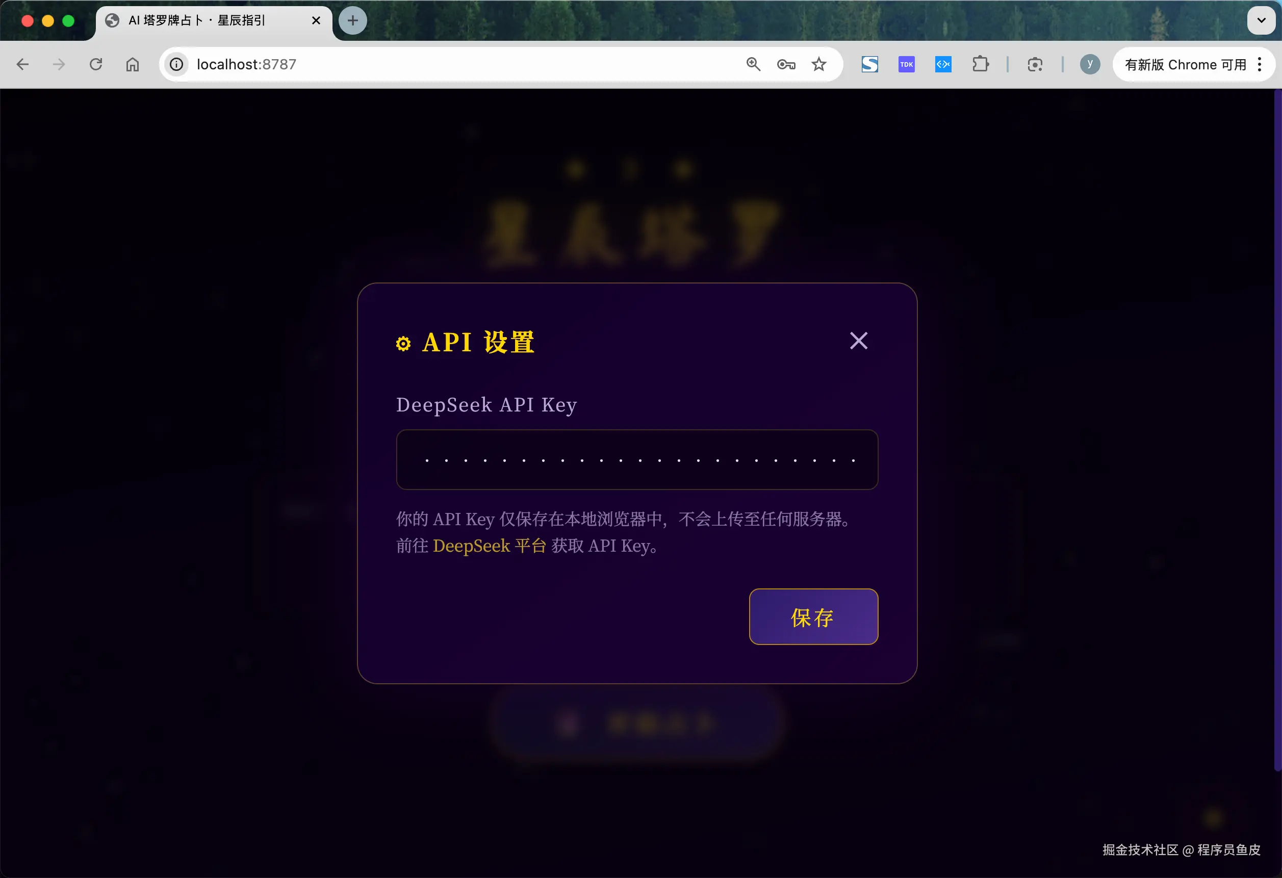 不过我还是喜欢在 Chrome 浏览器中测试,复制网址到浏览器中打开,然后输入从 DeepSeek 开放平台 获取到的大模型 API Key: