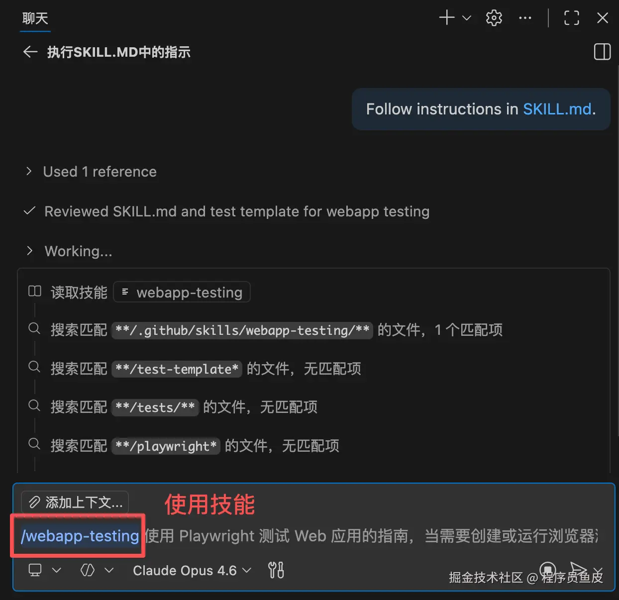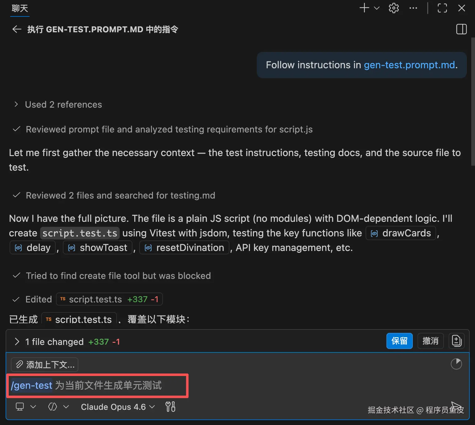 保存后,在对话框中输入 /gen-test 就能触发。你还可以在后面追加额外信息,比如 /gen-test 只测试登录相关的函数。