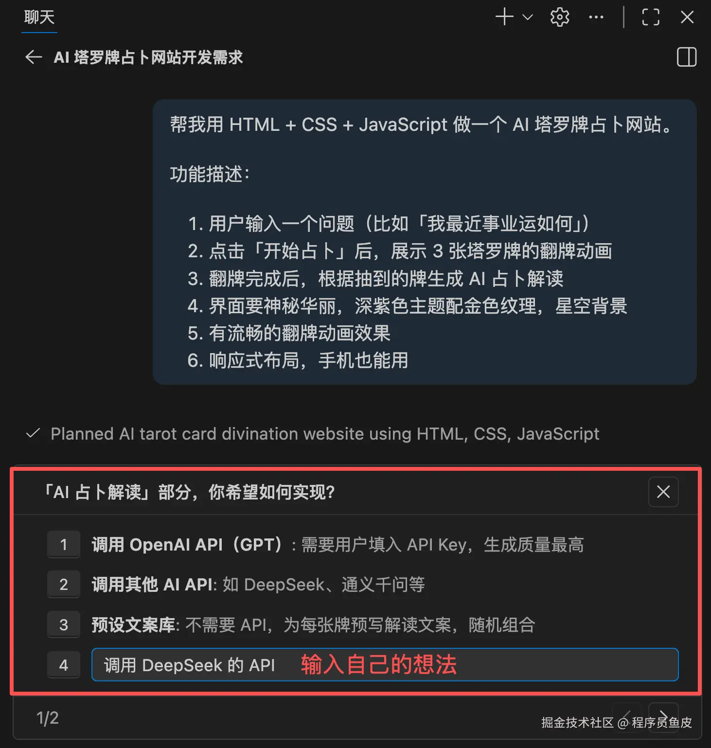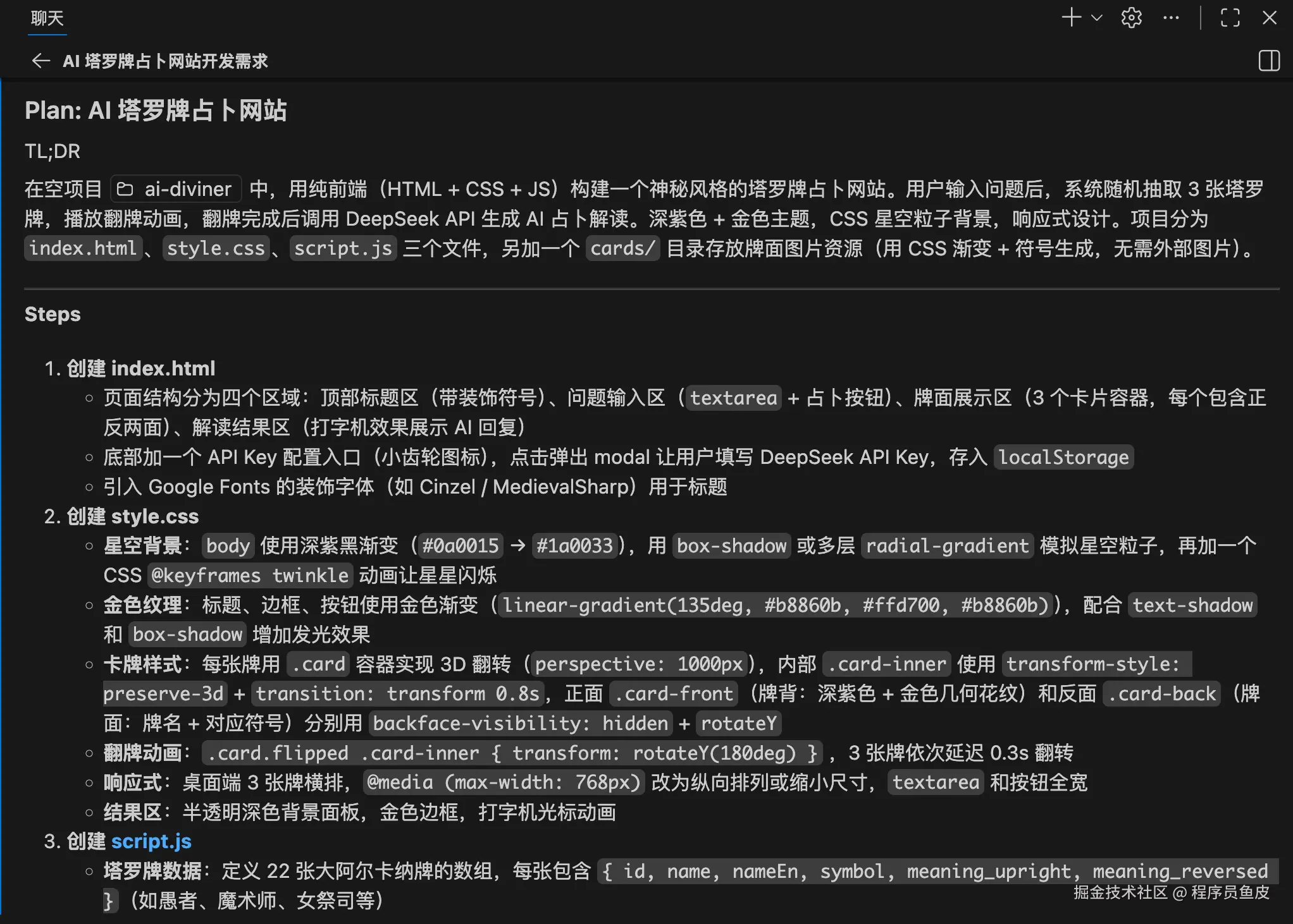 下面我带大家实战一把,结合 Plan 模式 + Agent 模式做个**「AI 占卜师网站」**,用户输入一个问题,让 AI 抽取塔罗牌并生成占卜解读。