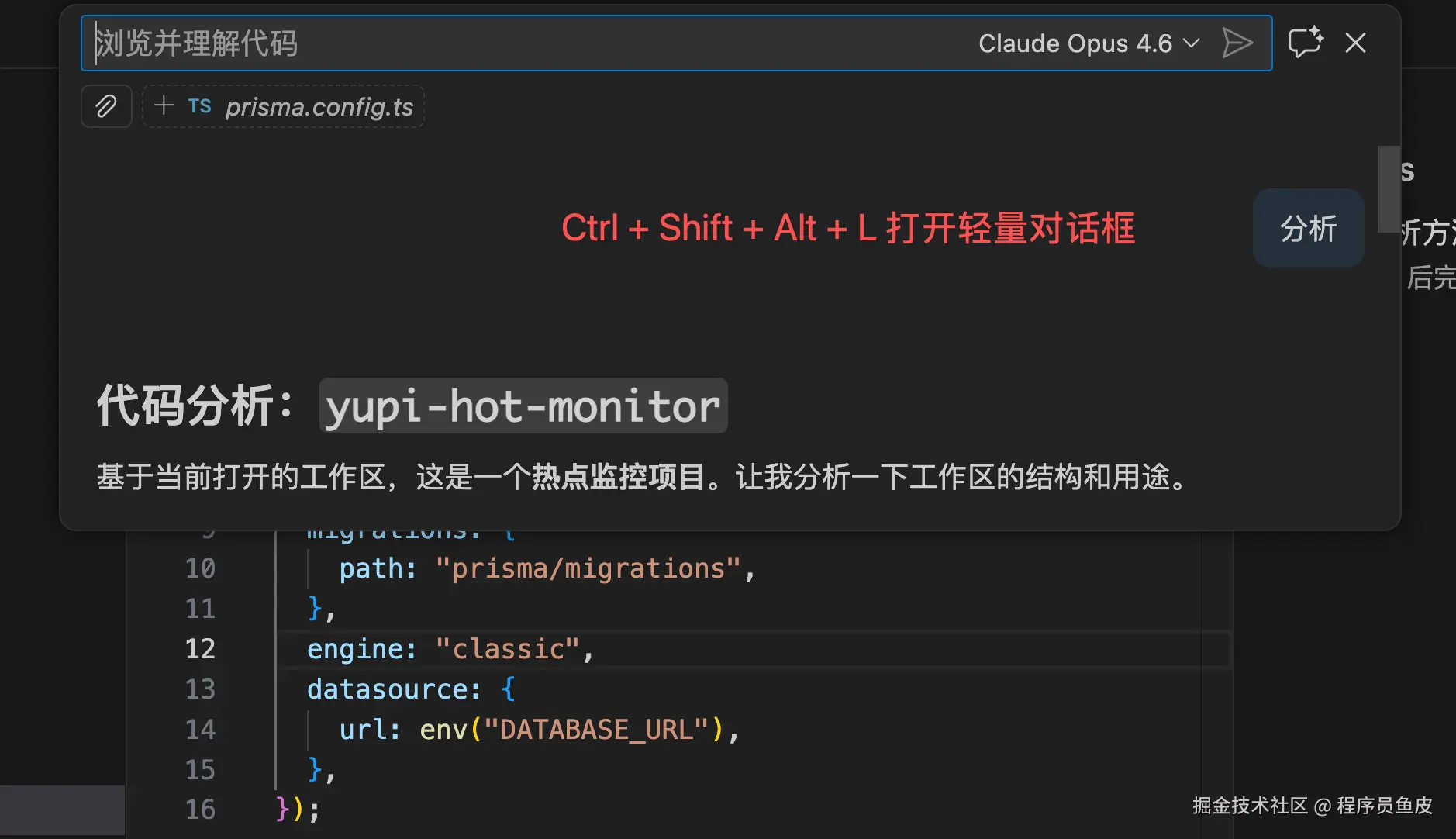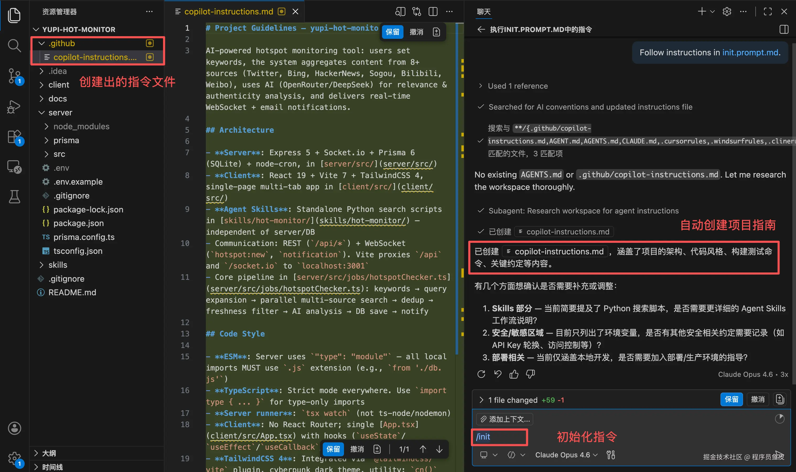 还有个小技巧,在对话区域里输入 /init,AI 会自动分析你的项目结构和代码风格,帮你生成一份自定义指令文件,省得自己从零写起。这个命令特别适合接手老项目、或者在已有项目上扩展功能的场景,AI 能帮你快速梳理出项目已有的编码习惯。