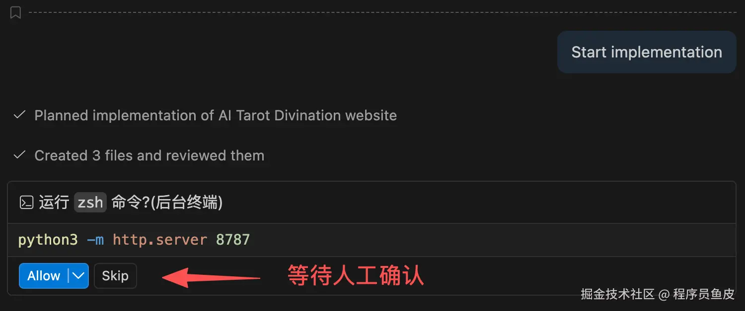 如果 AI 要跑终端命令或者调用某些工具,会弹出确认框让你审批,安全性有保障。