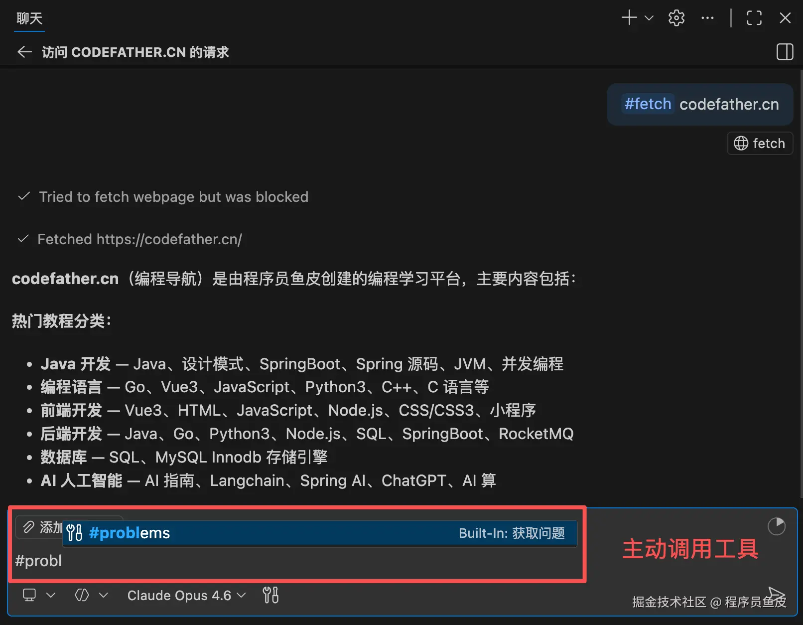 开启工具后,大多数情况下 AI 会自动判断该调用哪些工具。你也可以在对话中用 # 号手动引用特定工具,比如 #codebase 搜索整个代码库、#fetch codefather.cn 抓取某个网页的内容、#problems 查看当前项目的所有报错。