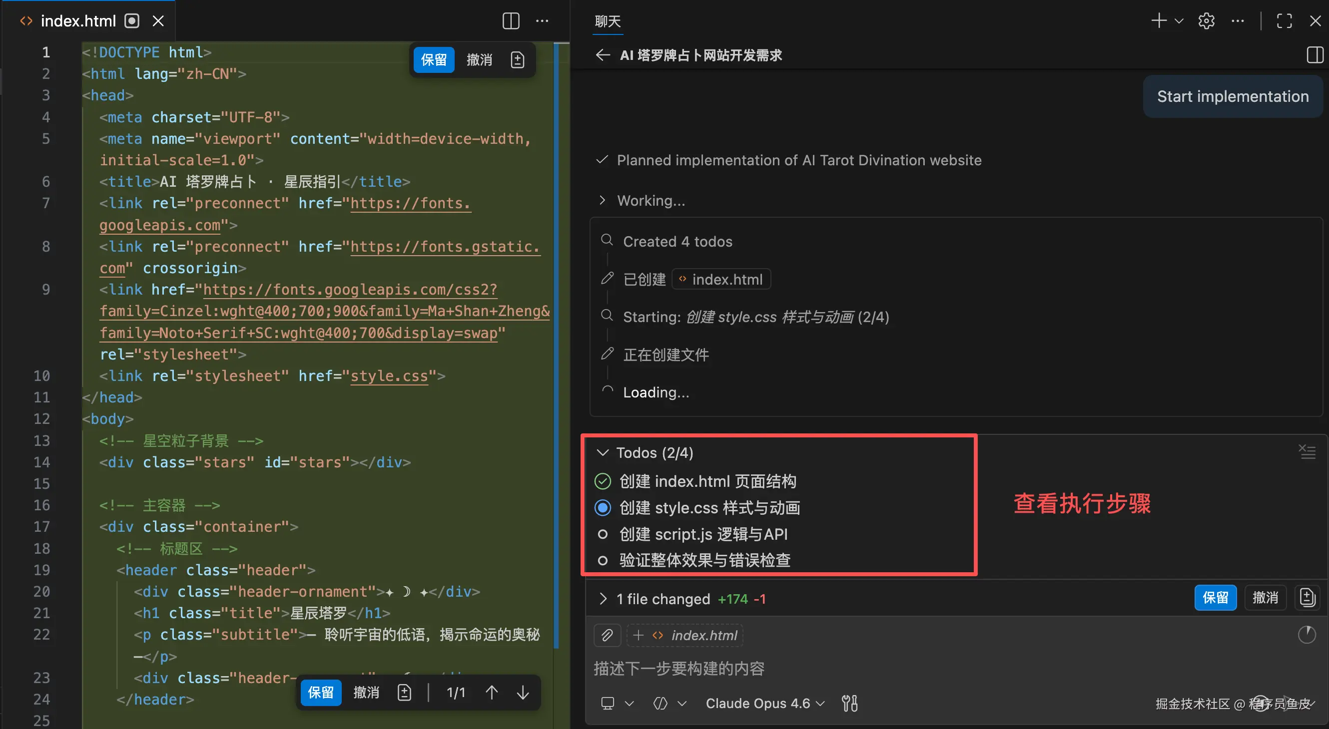 执行过程中,Agent 会自动管理一个 Todos 任务列表来跟踪进度。你可以清楚地看到 Agent 在做什么,比如创建 index.html、style.css、script.js 文件,往里面写代码,甚至可能会自动打开终端执行命令。