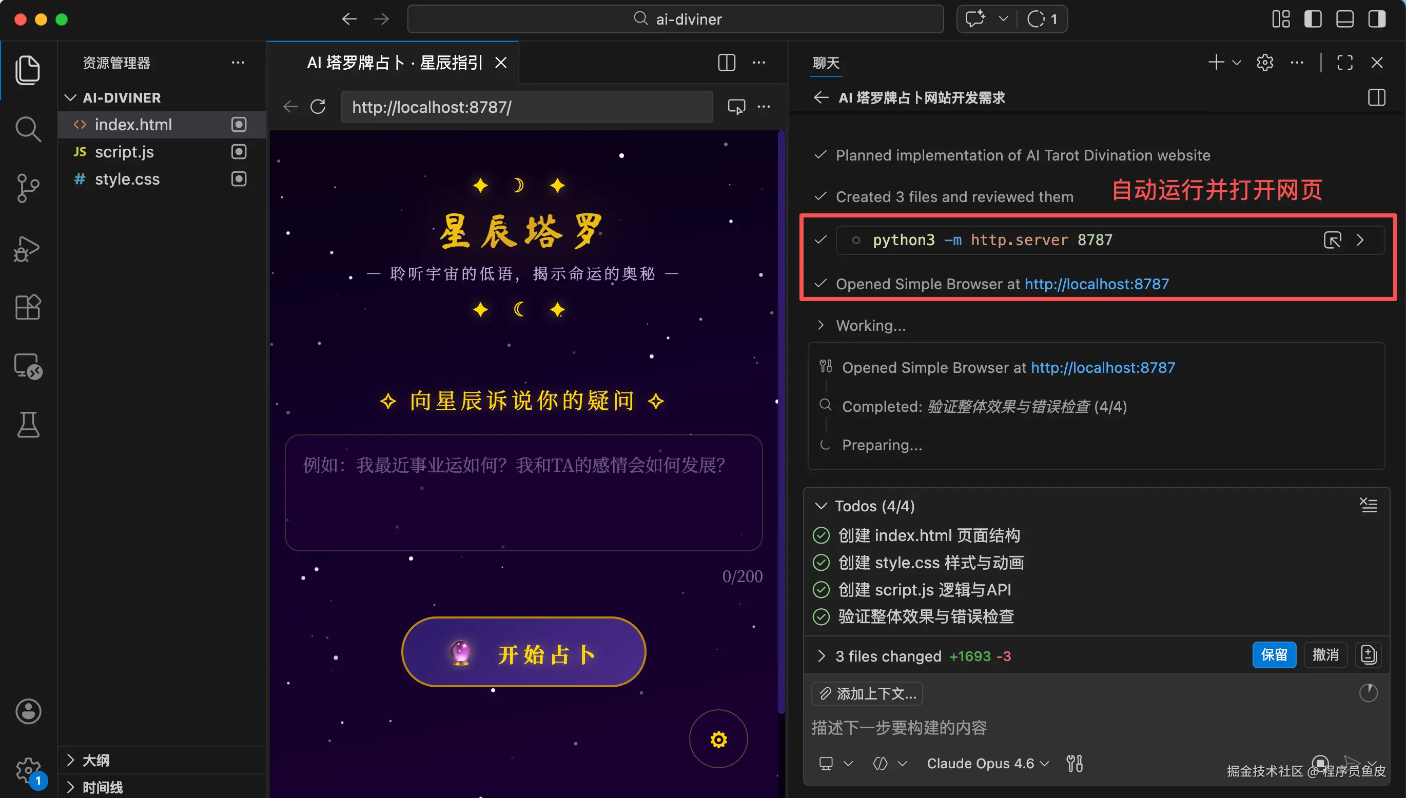 几分钟后,Agent 不仅完成了开发任务,还用 Python 启动了个 Web 服务器,帮我运行了网站。