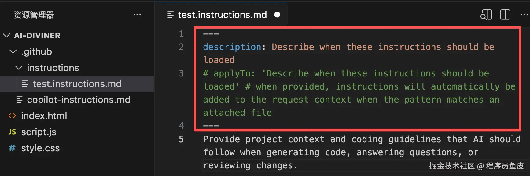 像下面这种带 YAML 头部的结构,就是 File-based 指令的标准写法,通过 description 字段描述何时生效、applyTo 字段指定匹配的文件模式: