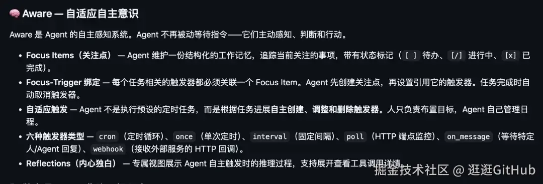 Clawith 最核心的创新叫 Aware,在 OpenClaw 的 Heartbeat 等机制上做了拓展和创新。