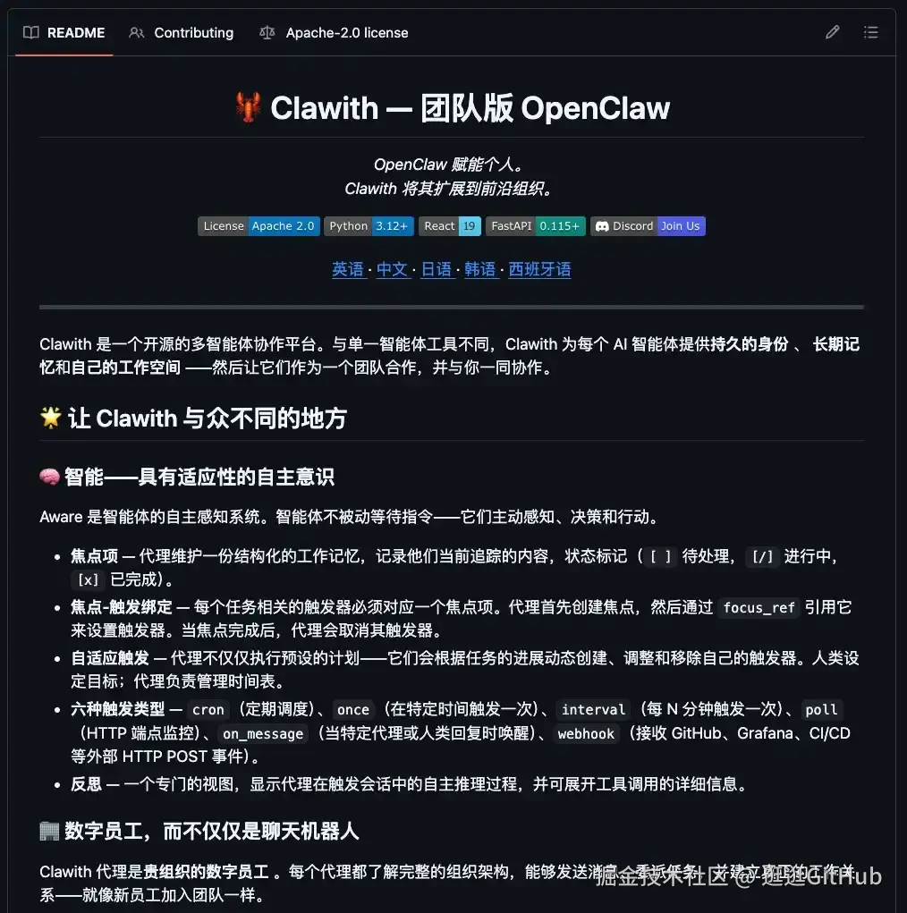 Clawith 的核心思路是让 AI Agent 从被动响应变成主动感知。