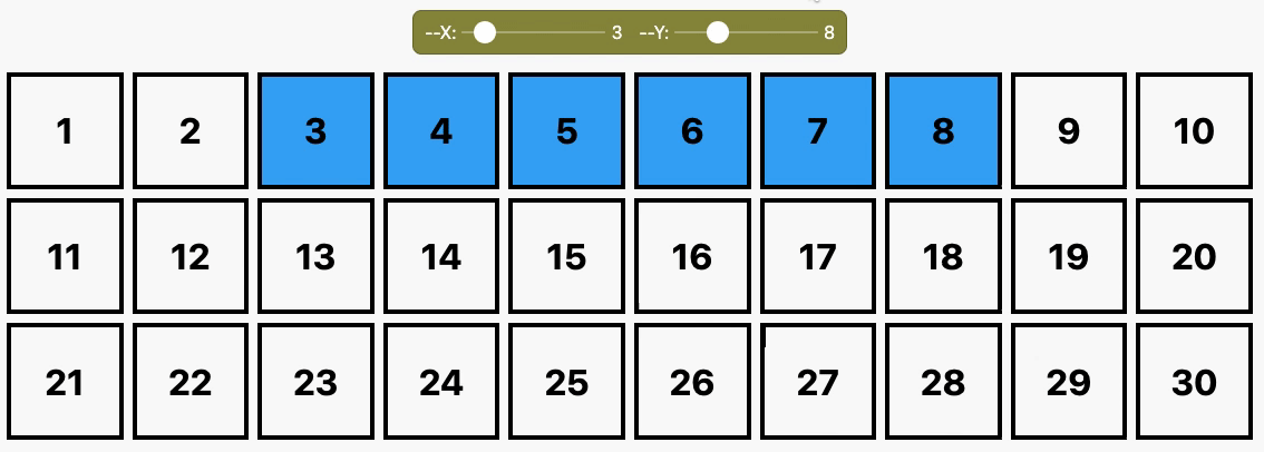 --X和--Y这样的变量,我们可以动态控制范围,而不需要修改选择器。这也是这种方法比传统:nth-child()更灵活的关键。详细介绍,请参阅《CSS 自定义属性你知道多少》和《CSS 自定义属性可以用来做些什么》 -