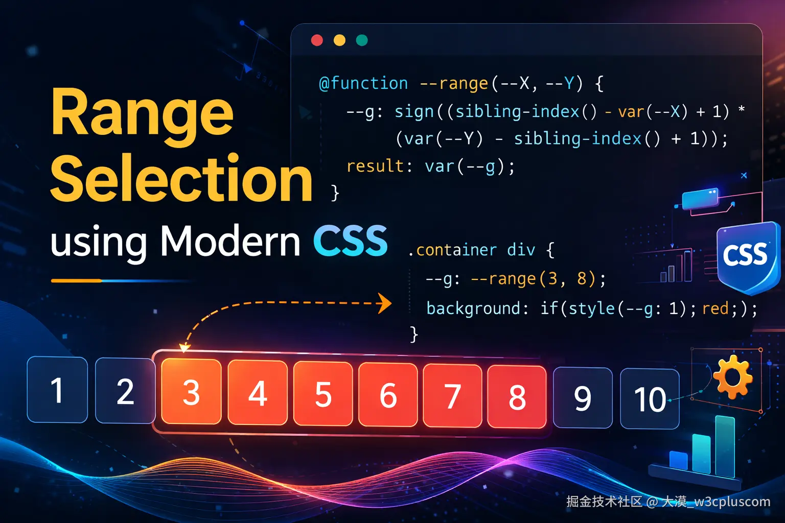 在此基础上,我们还将逻辑封装成一个 CSS 函数 --range() ,使代码更加简洁、可复用。通过这种方式,范围的起始值和结束值可以写成 CSS 变量,并通过交互(例如 range 滑块)实时修改,从而实现比传统 :nth-child() 更灵活的范围控制。