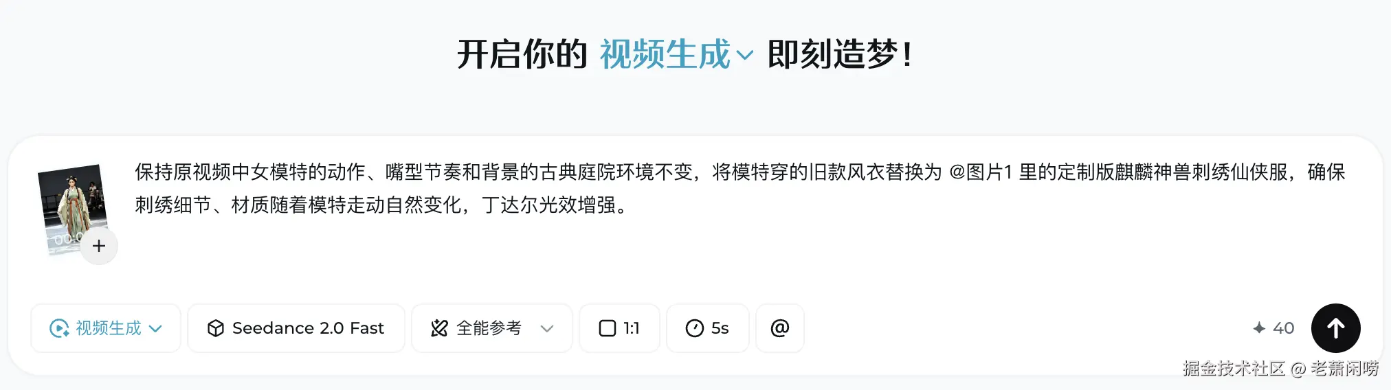 你的操作:导入原视频进入编辑模式,框选模特的旧款汉服。上传一张带有麒麟神兽和特定云纹的仙侠服生图作为细节参考。