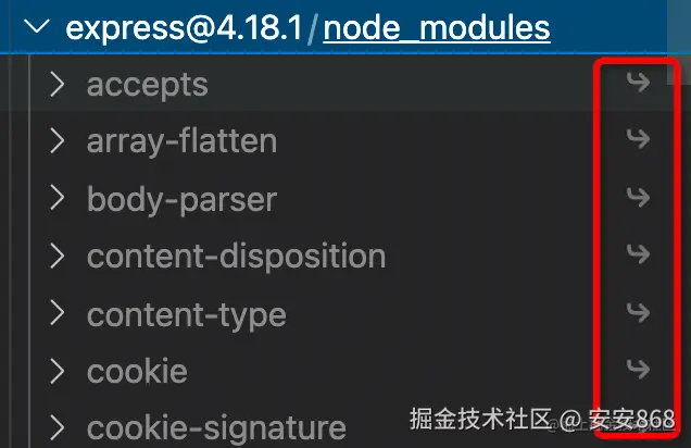 比如 .pnpm 下的 expresss,这些都是软链接,